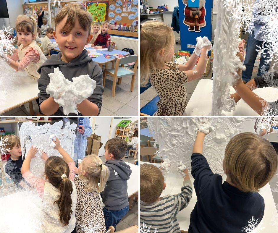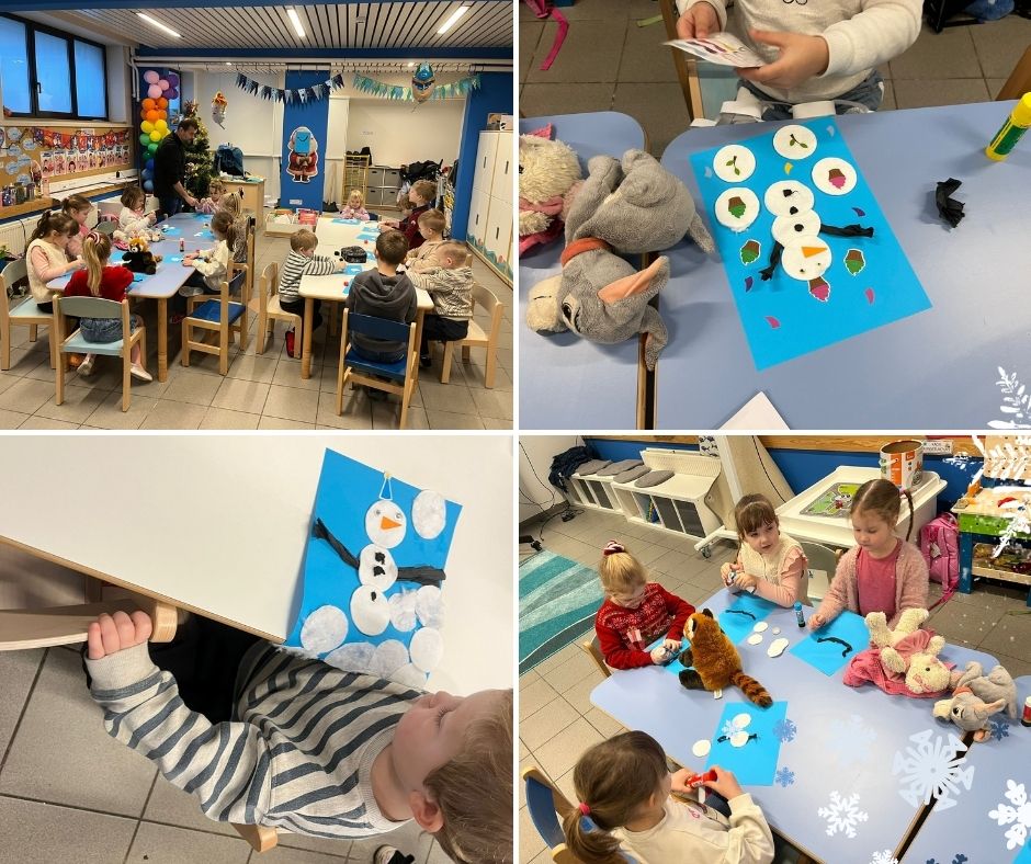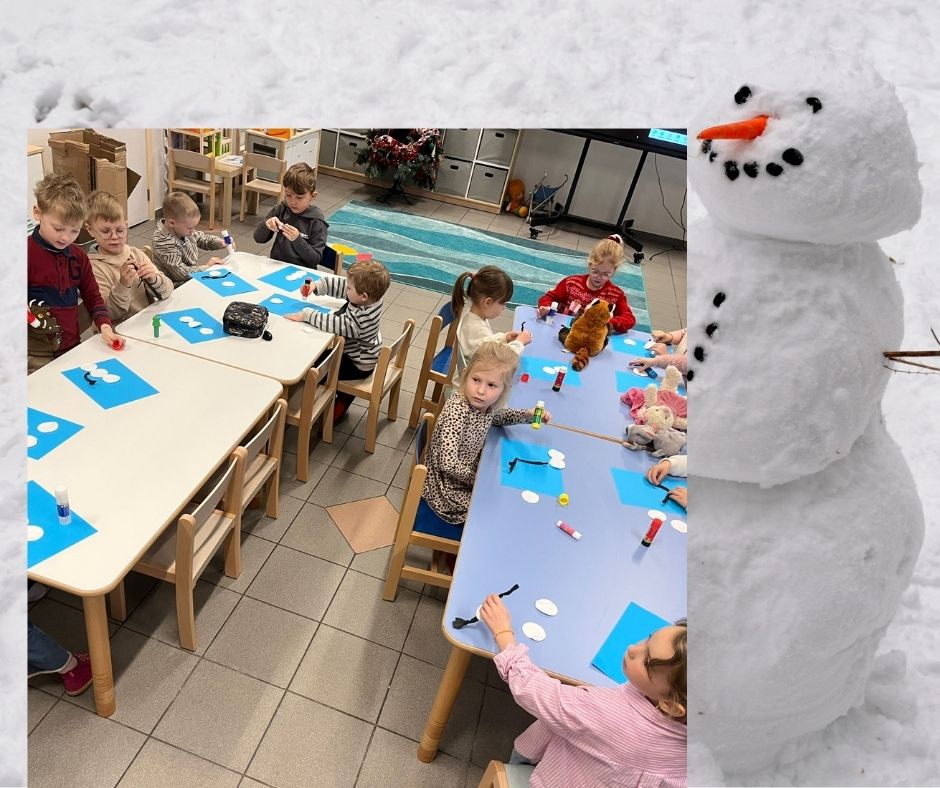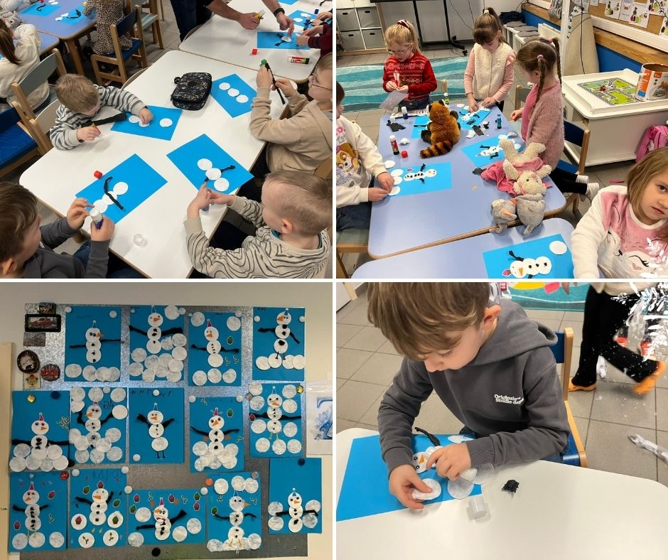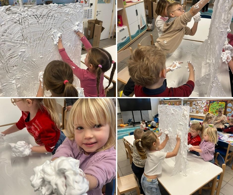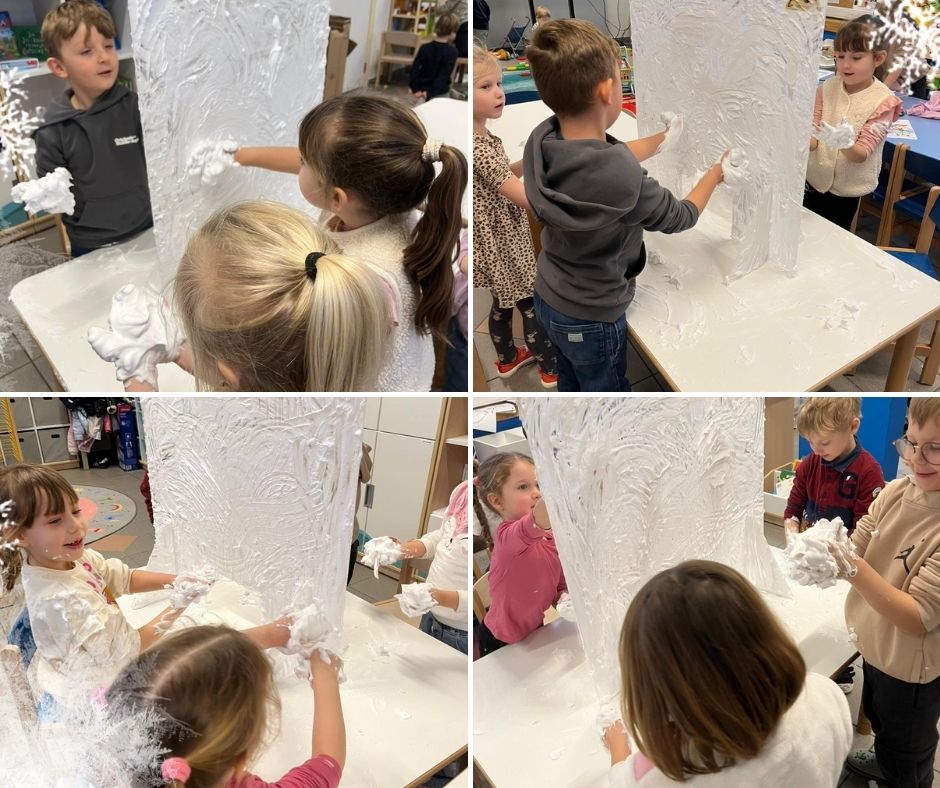 Mali artyści wyczarowali własny śnieg, z którego można było lepić prawdziwe, mięciutkie śnieżynki. Każdy mógł na(u)lepić swojego bałwanka — na kartce papieru! Nie zabrakło też kreatywnej zabawy przy malowaniu po „zamarzniętym oknie”, które okazało się idealne dla dziecięcej wyobraźni.
